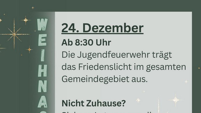 Am 24. Dezember ab 8:30 Uhr trägt die Jugendfeuerwehr wieder das Friedenslicht im gesamten Gemeindegebiet aus.